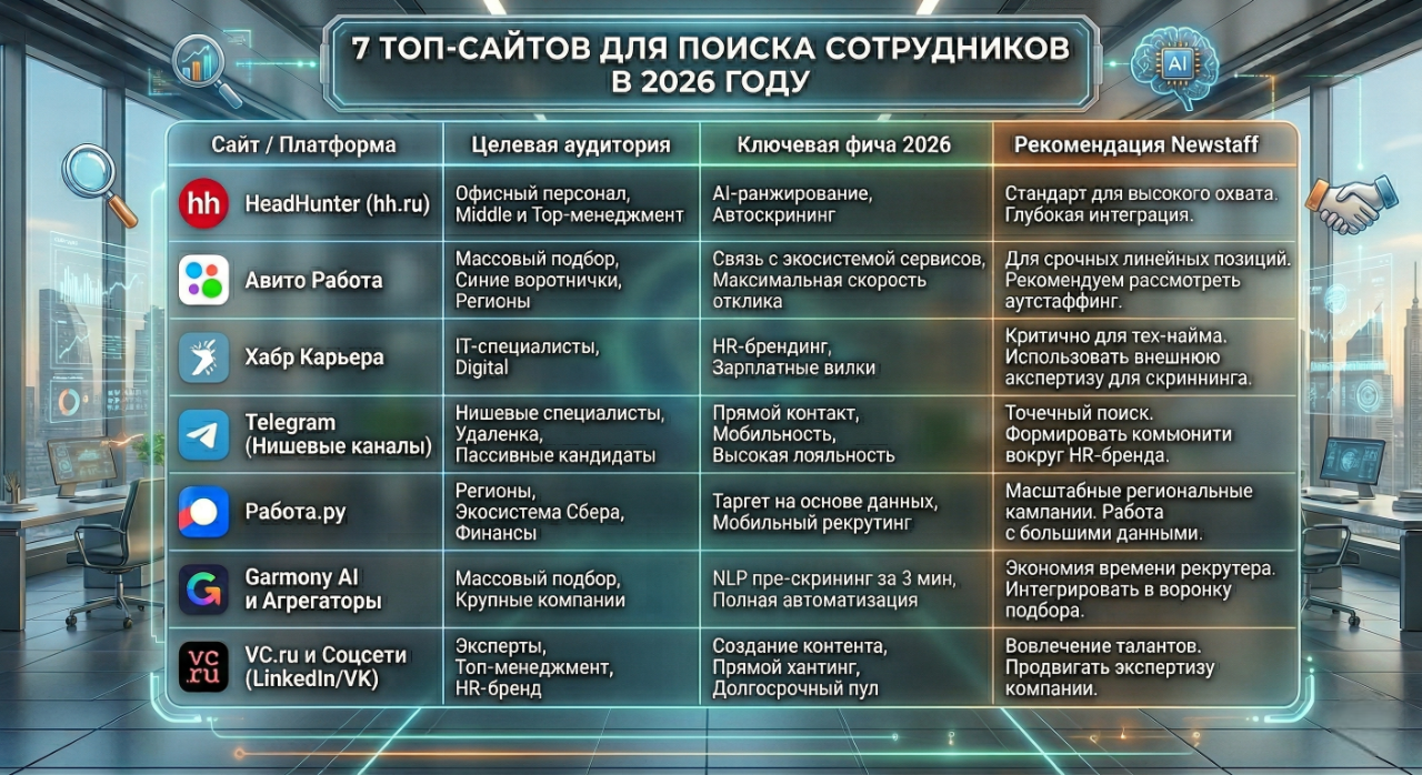 В 2026 году рынок труда окончательно перешел в фазу «рынка кандидата». Кадровый голод, активное внедрение AI-технологий и потребность в мультисервисном подходе к найму (NEWSTAFF) заставляют HR-директоров искать новые пути привлечения талантов. Если раньше было достаточно «открыть hh.ru», то сегодня эффективность рекрутинга зависит от выбора правильной комбинации площадок.